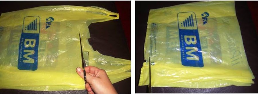 Cortamos la parte de las asas y el "culo" de la bolsa.