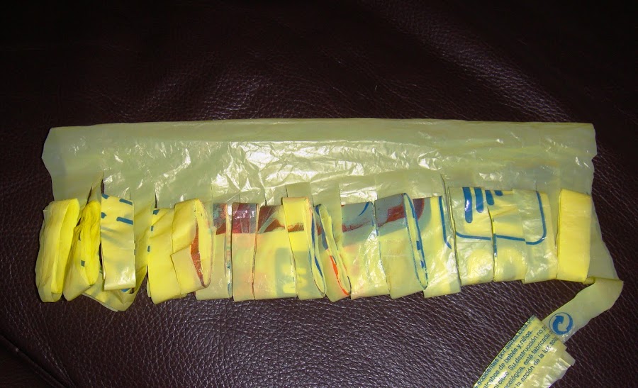 Cortamos flecos, de la parte plegada hacia arriba, y no llegamos hasta arriba. Cuanto mas finos sean los flecos, mas fino será el ovillo...pero ojo, también es mas fácil que se rompa la bolsa así que con cuidado....:-)