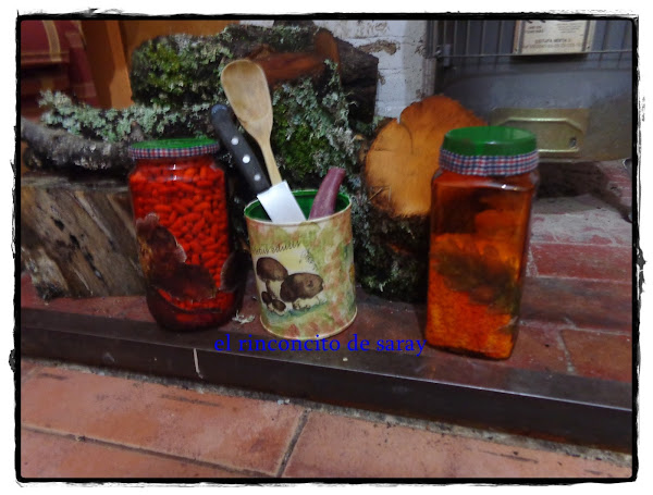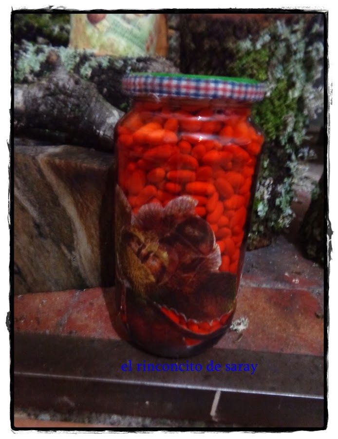 Este primero que es el bote de conserva , le di primero una mano de imprimación , luego le di una mano de pintura acrílica de color beis , luego le puse la servilleta de setas y para adaptarla al fondo con la ayuda de una esponja le fui haciendo el jaspeado con verde rojo ingles y un poco de amarillo colores típicos del otoño y para protegerlo le di cera incolora ya que no tenias barniz ene este momento jajaj
