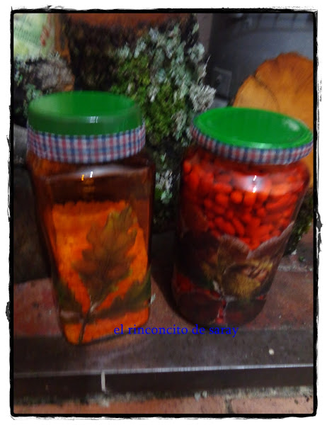 Los botes de cristal los pinte primero con pintura para cristal uno rojo y otro naranja , despues le puse unas motivos otoñales de unas servilletas , las tapas las pinte con pintura verde en spray y le puse una cinta par decóralo un poco