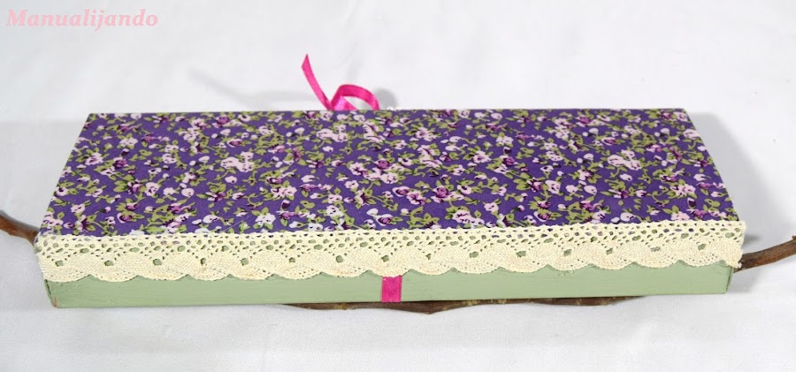 Y tra la tela, pinté la parte de abajo de la caja en verde y.en principio para cerrarla le puse unos velcros, pero no quedaban muy allá y se despegaban, así que se me ocurrió la cinta para cerrarla.
