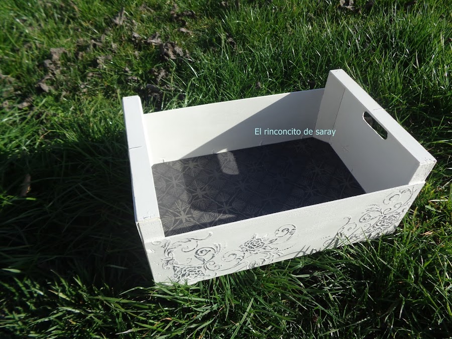 La pinte con pintura de tiza en color gris claro , le hice un estuco con agua plas ,al que le pinte de negro y di con vela para cuando lijara saliera el negro con el gris . También le corte una base de madera finita ya que las tablas que traía eran demasiado finas y quebradizas , la base la forre con papel de empapelar y para finalizar le di dos manos de cera incolora