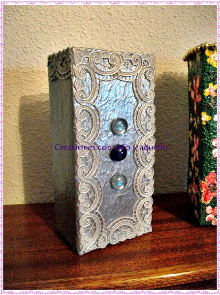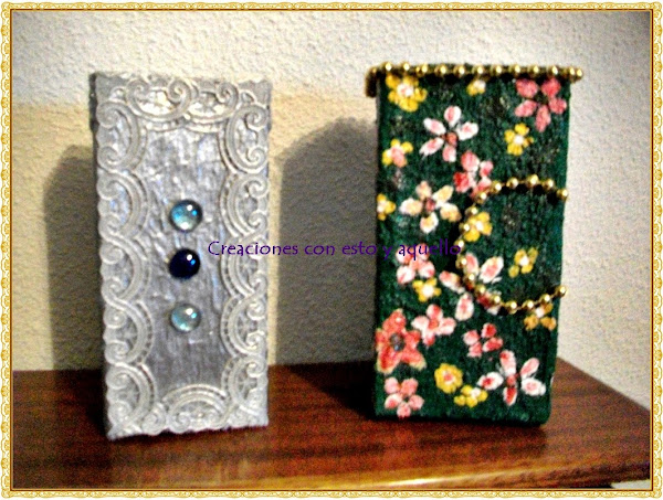 La otra recubierta con papel y cola y pintada con pintura plateada y los detalles que tiene de adorno son de una carpeta muy vieja de plástico. Le recorté los bordes y pegué con silicona caliente.