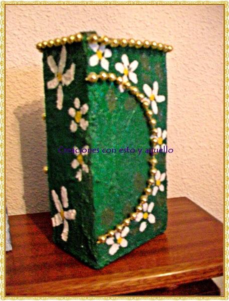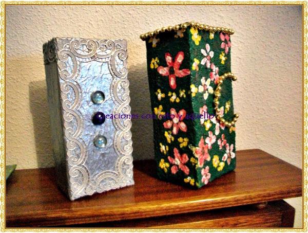 La que está pintada de color verde la hice recubriendo la caja con papel de cocina humedecida en arena mezclada con cola y le dió una consistencia realmente muy fuerte . Díficil darse cuenta que dentro hay una caja de cartón.