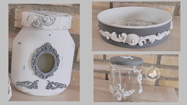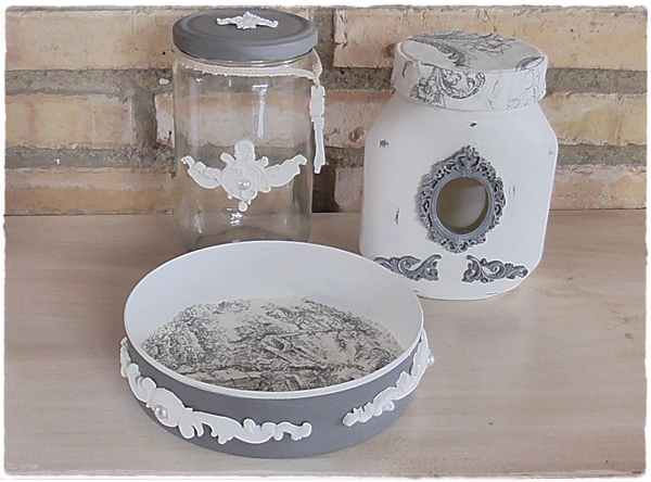 El siguiente tarro es mucho más sencillo, simplemente pinte la tapa con pintura tiza y le pegué las piezas, dejando el cristal tal cual, así de simple jajaja.