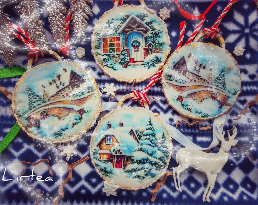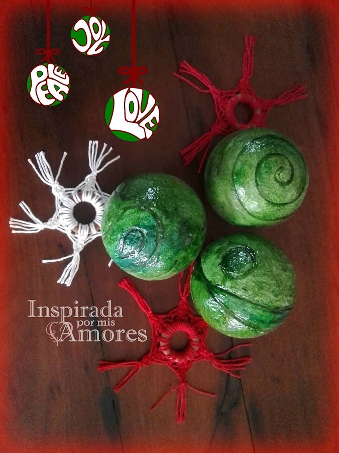 5.- Después, y con mucha paciencia, con pintura acrílica y pincel, aplicamos el color correspondiente, en el orden: verde, rojo y dorado. Para terminar, una capa de brillo protector.