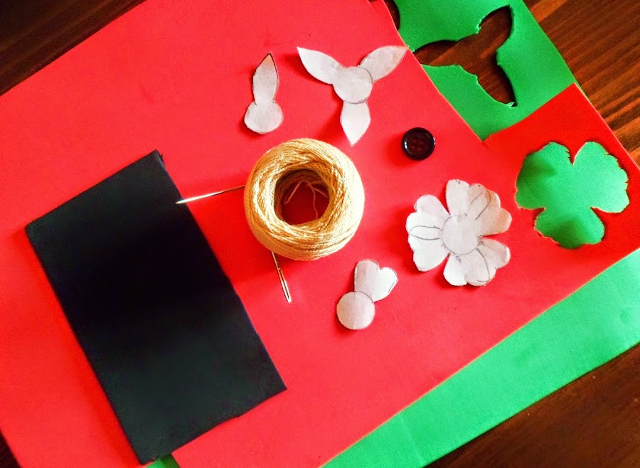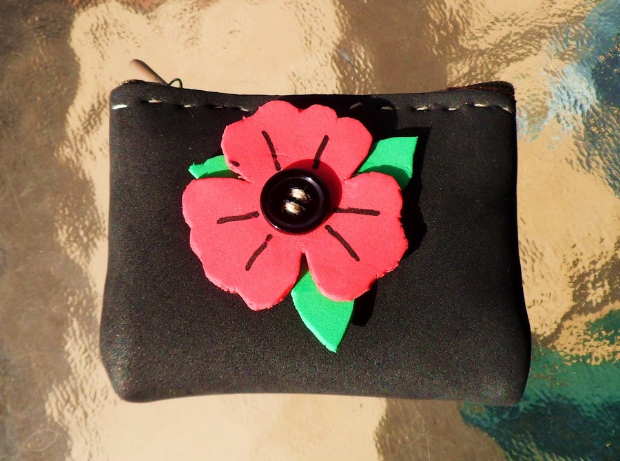 Me gustó la idea de ponerle una flor en goma eva roja con unas hojas en goma eva verde de fondo, pegadas con un poco de pegamento y cosidas al monedero con un botón, así además de adornarlo queda más fuerte.