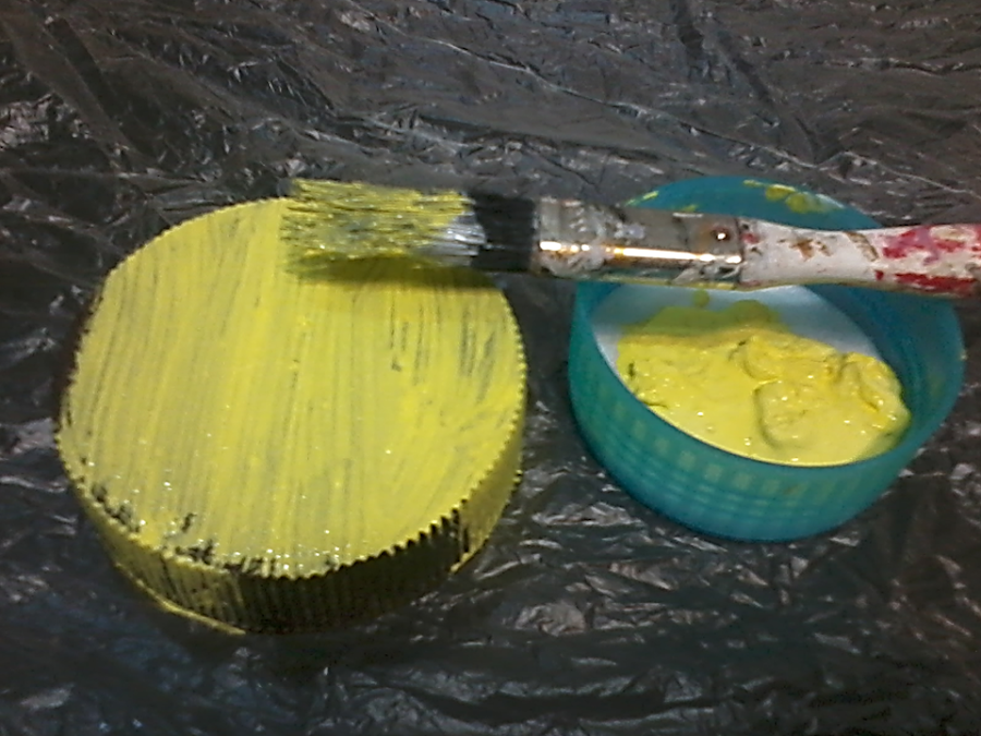 Las tapas podemos pintarlas con pintura acrílica, solo que si son de color obscuro, debemos aplicar dos capas. Cuando estén bien secas, aplicar una capa generosa de barniz transparente o acetato líquido, este último es muy parecido en textura y color al pegamento blanco simple, y tiene la virtud de endurecer, dar brillo y proteger de la humedad, pues plastifica cualquier material. Lo encuentras en ferreterías y tiendas de pintura.