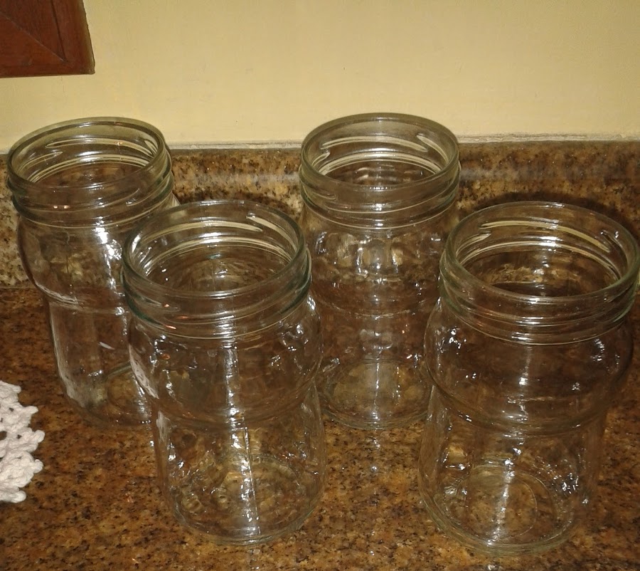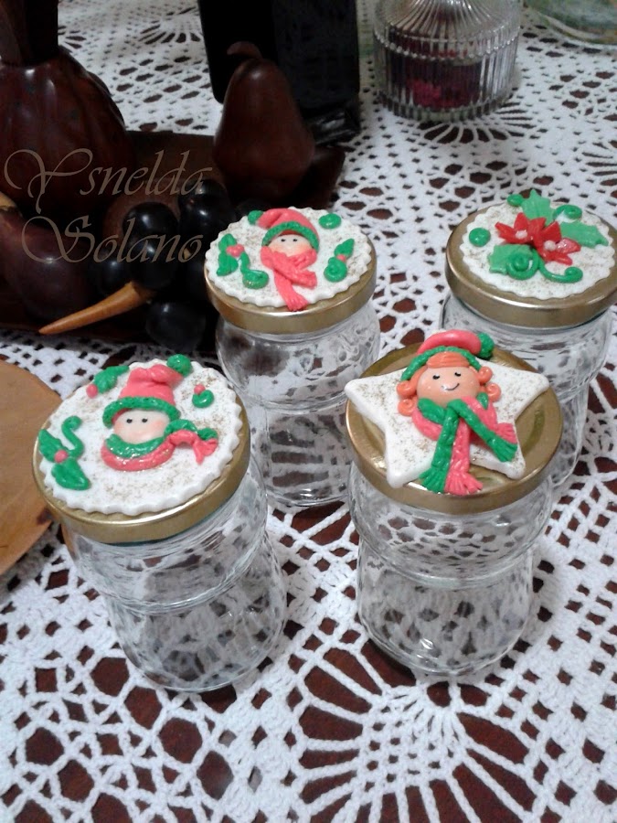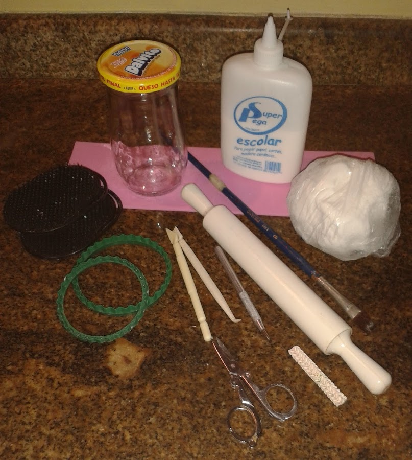 Busque unas tapas unicolores, conseguí unas doradas, que quedaban estupendas con estos frascos. A parte de los frascos y sus tapas, usaremos, porcelana fría (y pinturas para teñirla), cola escolar y herramientas para trabajar la porcelana fría.