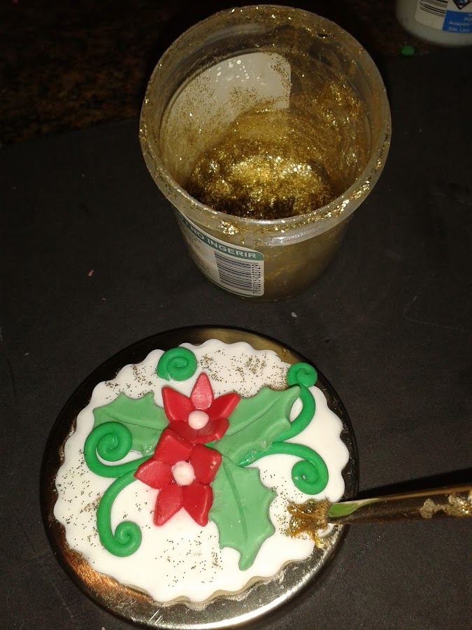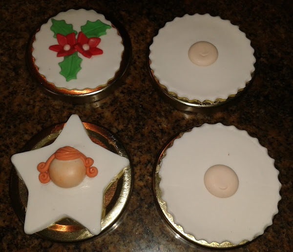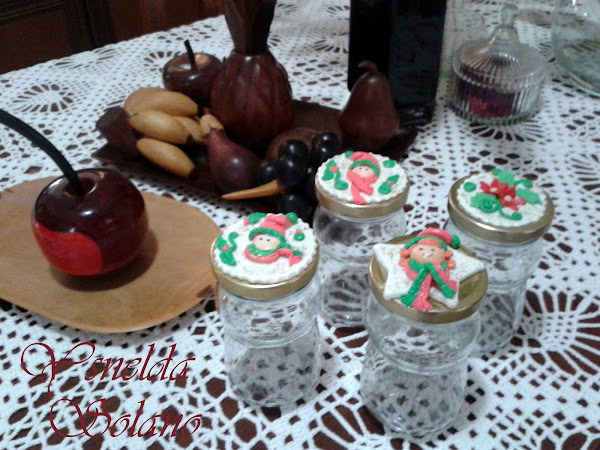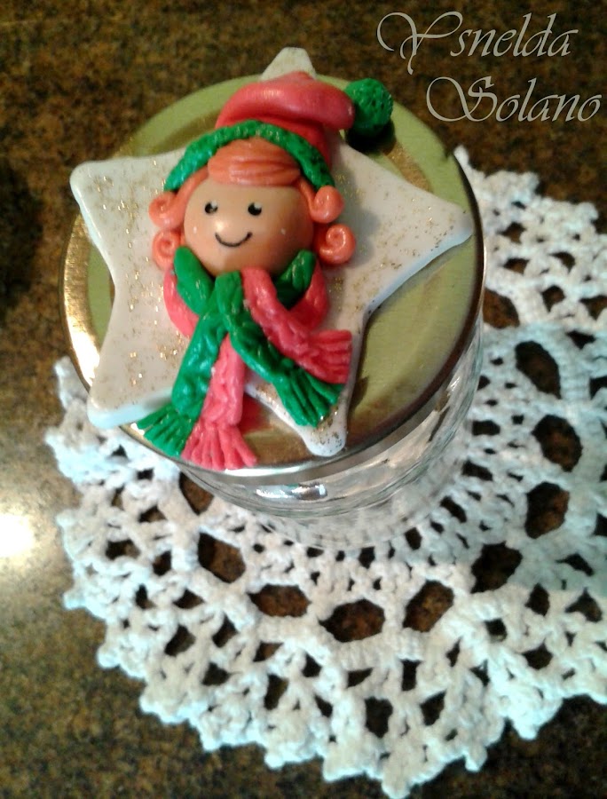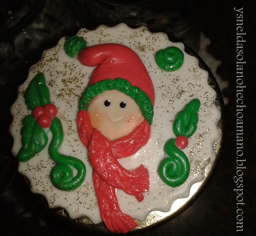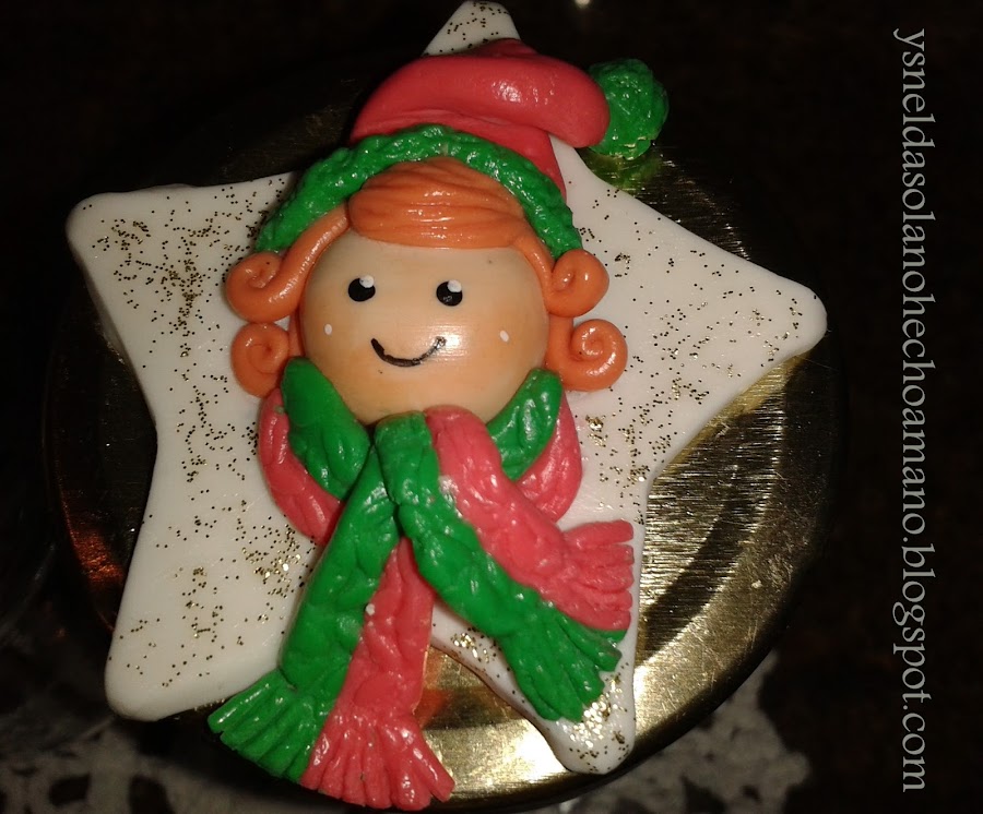 1) Con cortador y porcelana fría realizamos, tres circunferencias y una estrella, que pegamos a la tapas. En el caso de las flores de navidad y sus hojitas, se realiza todo con cortadores (sólo estirar y marcar con el cortador). Con las demás tapas, haremos unos niños con su atuendo de invierno.