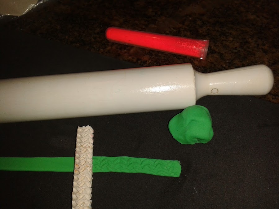 2) Para el gorro de navidad realizaremos un cono en pasta flexible de color rojo, dandole la forma indicada en la foto y adornando con su borlita y una tira texturizada con los cepillos. Para la Bufanda se texturiza con rodillo una tira o rollo aplanado, de colores verde y rojo. Para complementar la información pueden ayudarse con el paso a paso de Copos de Nieve para el Árbol.