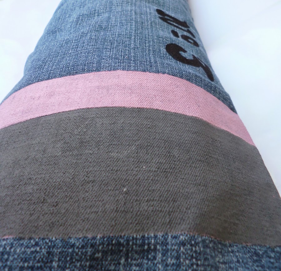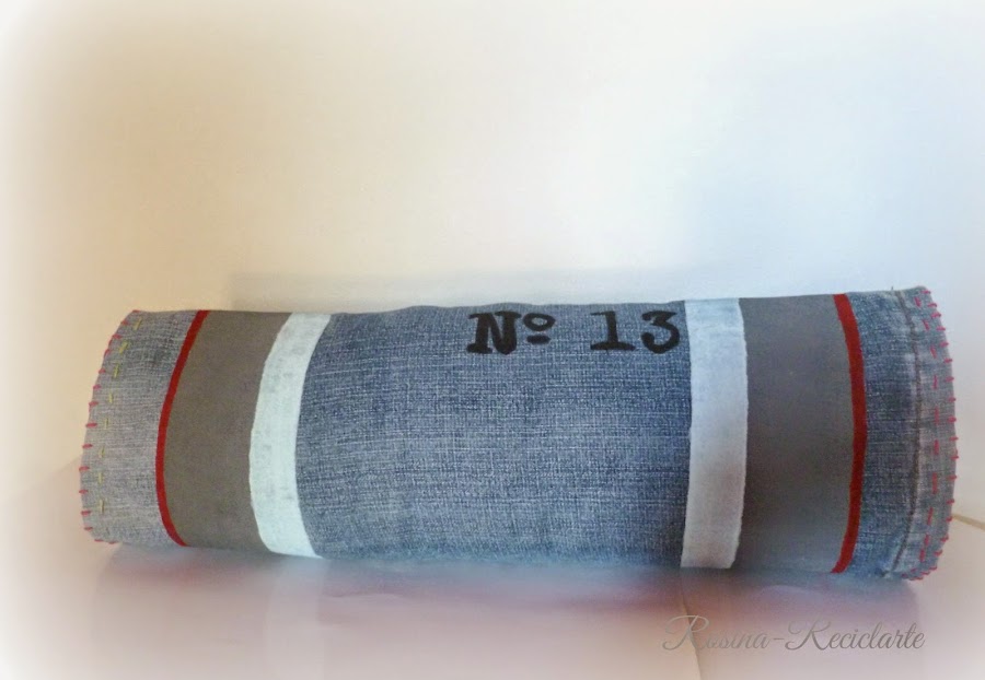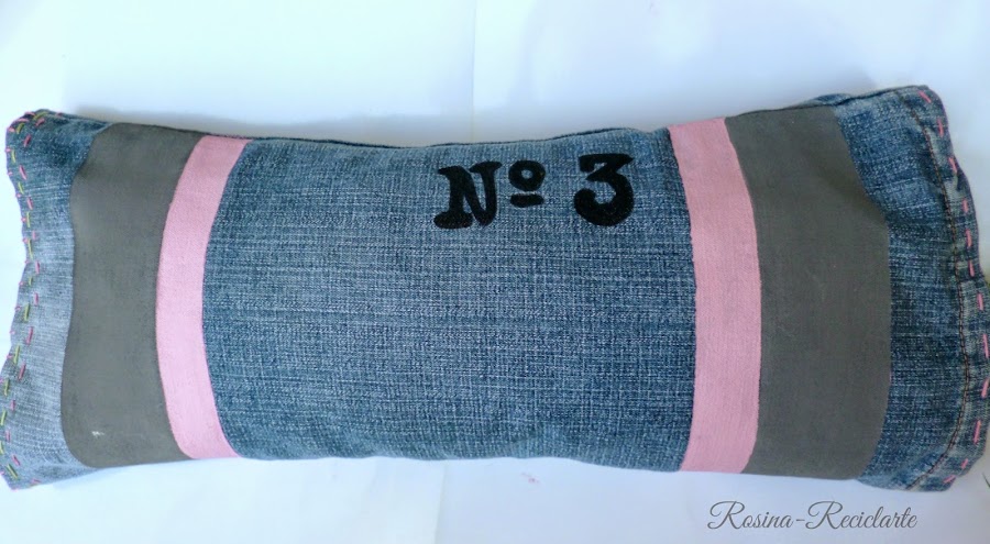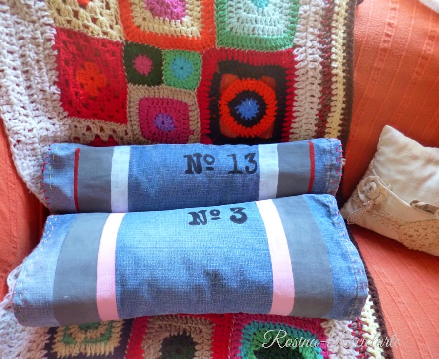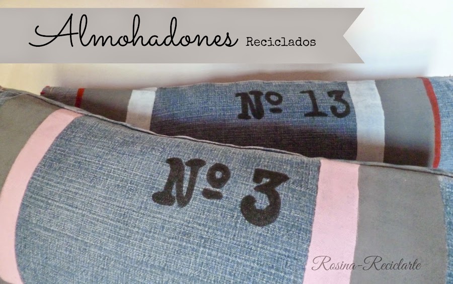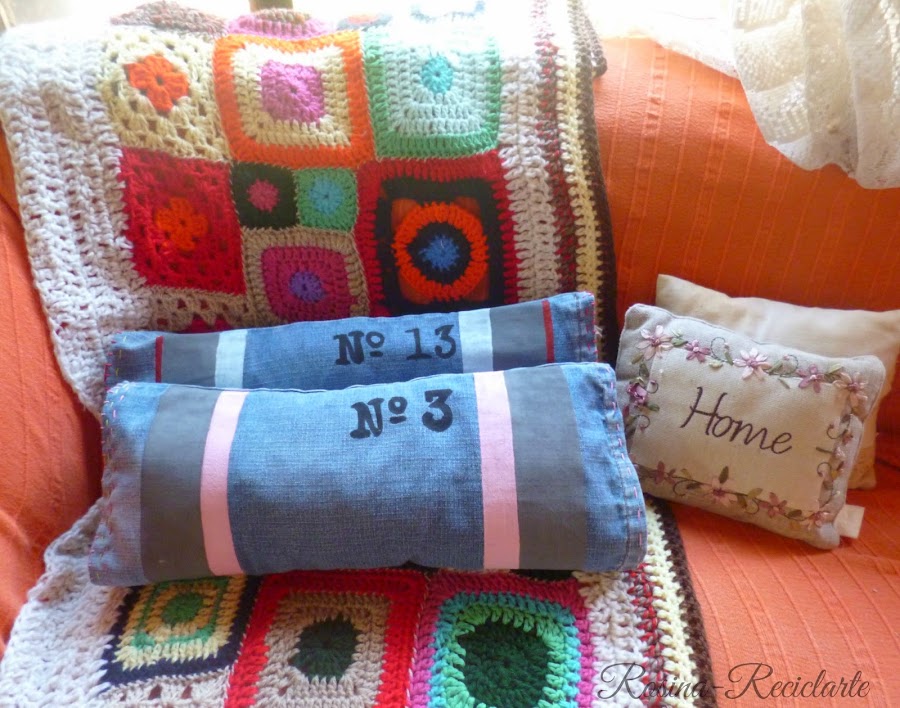 y les muestro este par de fundas de almohadones que hice con las piernas de un jean.