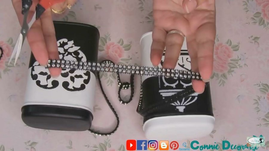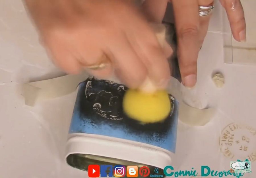 Ahora decoramos con una cinta de diamantes, alrededor de la tapa y el borde del tarro, la pegaremos con silicona, teniendo en cuenta que no puede ser muy gruesa la linea, porque se salga de la cinta.