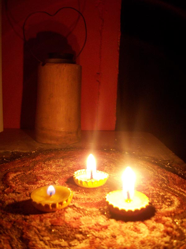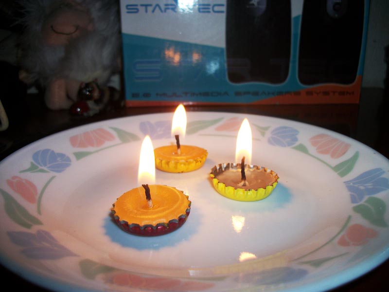 Para las velitas derretí una crayola de color amarillo que tenía por ahí, al baño maría, con cuidado de que no le cayera agua y revolviendola de vez en cuando, aparte derretí una vela y bañé 3 pedacitos de cordeles en la parafina para hacer los pabílos, luego metí esa mezcla en las tapitas y les puse el pabílo, se ven preciosas :)