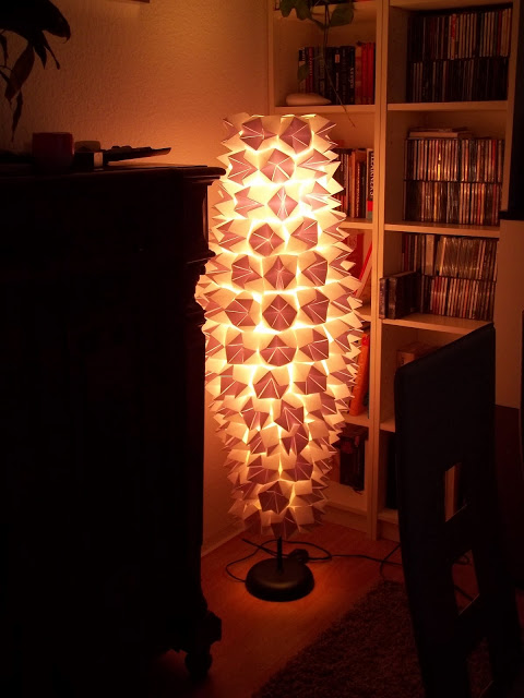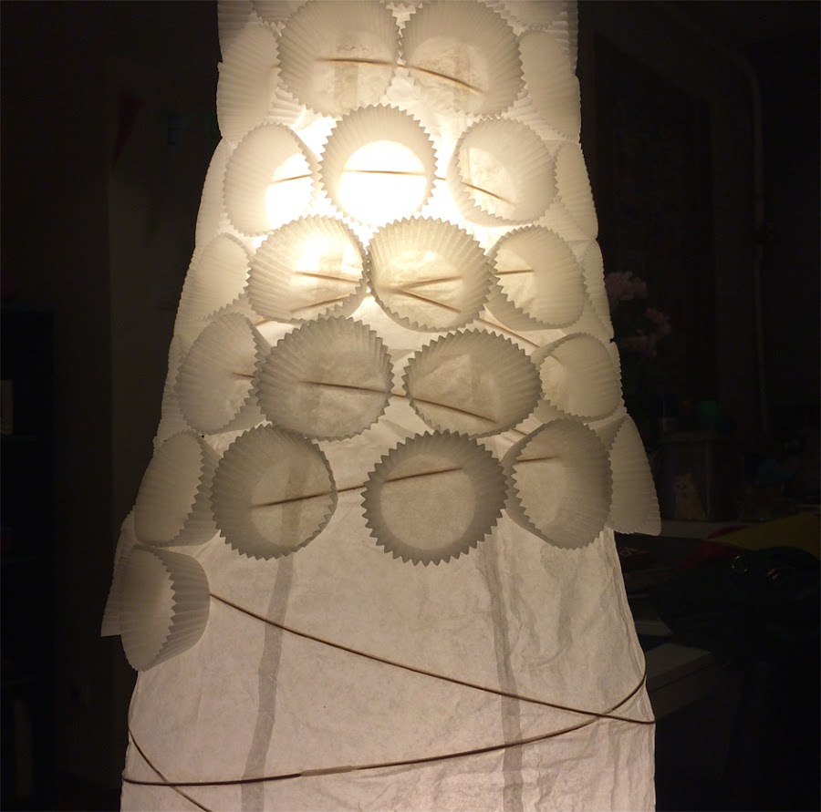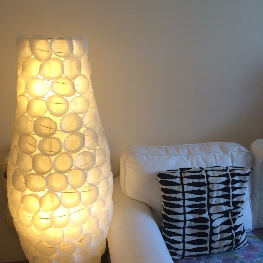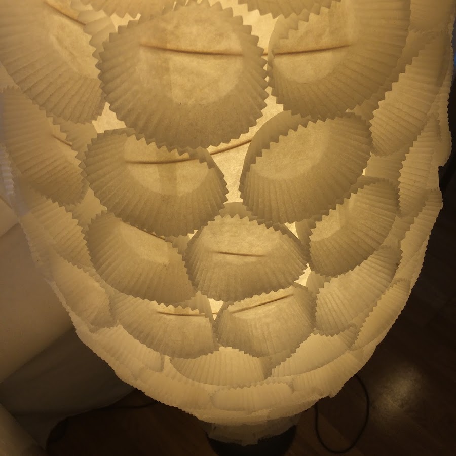 No os pongo esta vez foto de materiales porque esto es tan simple que no es necesario, necesitáis papelitos de magdalenas a vuestro gusto, yo los puse blancos porque ya tengo suficiente color en casa. También necesitáis algo para pegarlos a la lámpara, yo recomiendo algo que pegue rápido ya sea silicona caliente o un pegamento de esos potentes.
