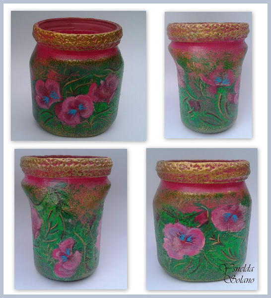 En este frasco con decoupage, la base superior es una tira de porcelana fría texturizada con rodillo. Y las figuras y colores de la servilleta fueron resaltadas con pinturas acrílicas.