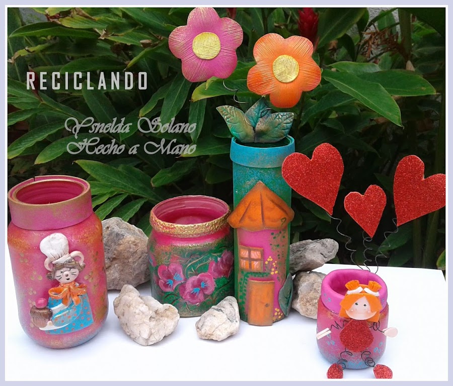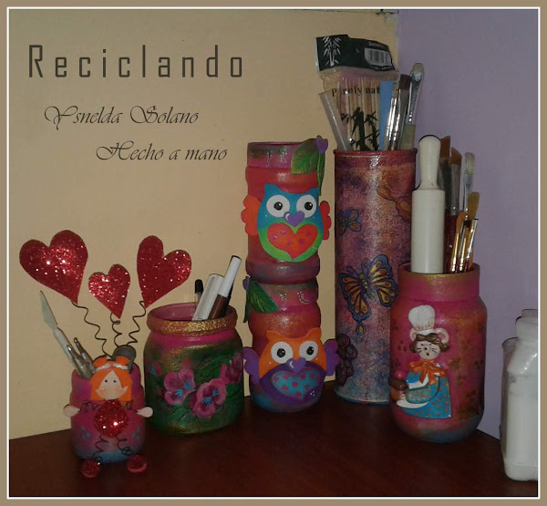 Acumulo con estos cuatro trabajos de hoy, ocho reciclajes incluyendo la botella con mandala. seis de ellos para la organización de mi escritorio, ya no estan como en la foto sino que ya estan llenos de "cuanta cosa" :)