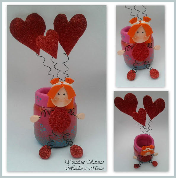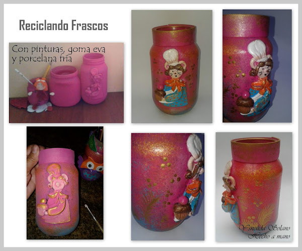 Tanto el frasco de la ratona como de la muñequita en su parte superior llevan una tira de goma eva, pintada con esponja al igual que el resto del frasco. La ratona es un viejo trabajo realizado sobre este frasco de mayonesa, el cual, digamos decidí darle una nueva vida o restauración, pintando la ratona toda de fucsia para luego con pincel seco, colocar nuevos colores en cada parte de esta figura de masa flexible.