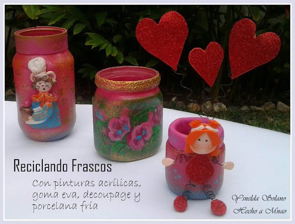 Las cuatro ideas de reciclaje se desarrollan sobre frascos y un pote de desecho, de diferentes tamaños, inicialmente la preparación de cada frasco consistió en "esponjear" (aplicar pintura con la esponja) con pinturas acrílicas de los colores, fucsia, naranja, azul turquesa, verde y dorado.