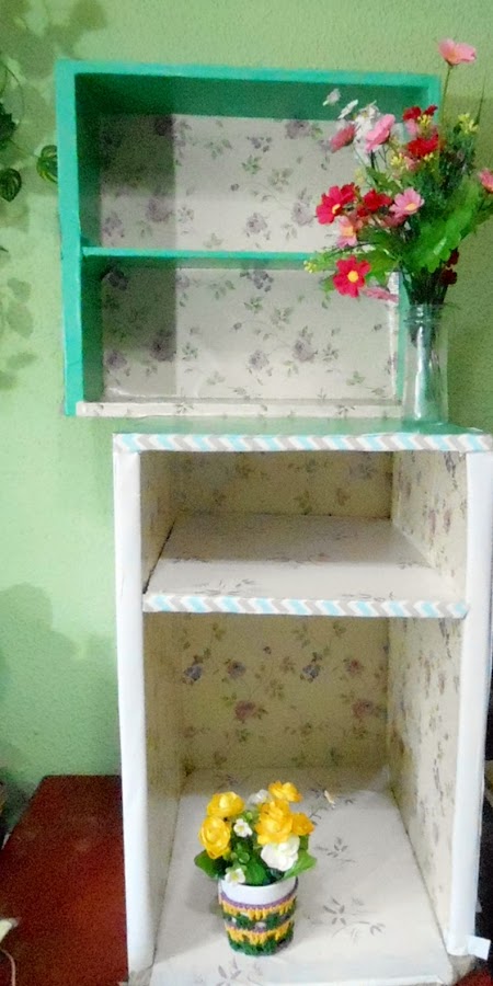 Lo segundo que encontré fue un mueblecito con dos estantes, todo cubierto de un vinilo viejo y sucio. Lo quité todo, cuidadosamente. De nuevo olvidé hacer la foto del antes. Como la superficie quedó pegajosa por más que la limpiaba con vinagre y bicarbonato (gran limpiador), y con alcohol, de nuevo opté por forrarlo con vinilo. Y para que hiciera juego con el estante anterior, cubrí la parte superior de verde, el resto de blanco, y el interior del mismo vinilo crema con flores violetas.
