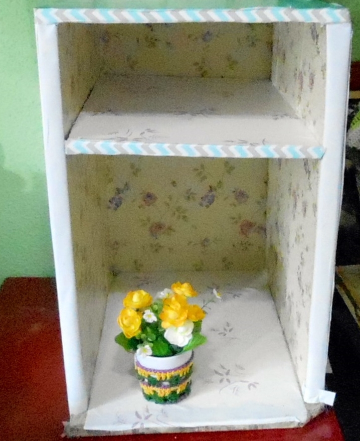 En el borde puse un poco de whasi tape de color gris y verde. Como el blanco se me acababa, puse un vinilo con flores lilas en la balda y en la parte inferior.