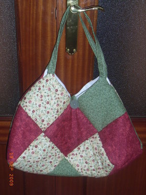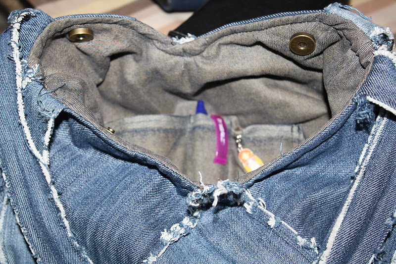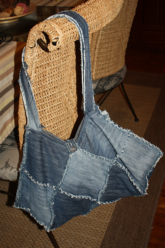 Elegí un pantalón de esos de campana, y de cada pata corte los cuadrados, con el sobrante hice las asas. Y como era cuestión de reciclar, ya veis que recicle hasta el botón y una de las trabillas para hacer el cierre.