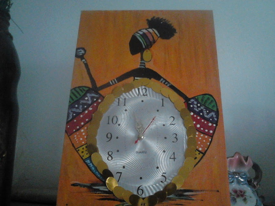 ESTE RELOJ TIENE UNA HISTORIA ALGO LARGA, PERO BUENO ME LO REGALO UNA VECINA, VENIA EN UN MARQUITO QUE POR SUPUESTO ESTABA QUEBRADO.LO GUARDE LARGO TIEMPO HASTA QUE SE ME CRUZO EN EL CAMINO, ESTA DIVINA NEGRA Y SE ME OCURRIO RECICLARLO, EL DIA DE HOY TUVE QUE CAMBIARLE LAS AGUJAS, COMO SE VEN SON FINITAS Y NO LAS VEIA, JAJAJA..AHORA SON NEGRAS Y GRANDES, IGUALMENTE HAN QUEDADO SUPER.. ME GUSTAN..
