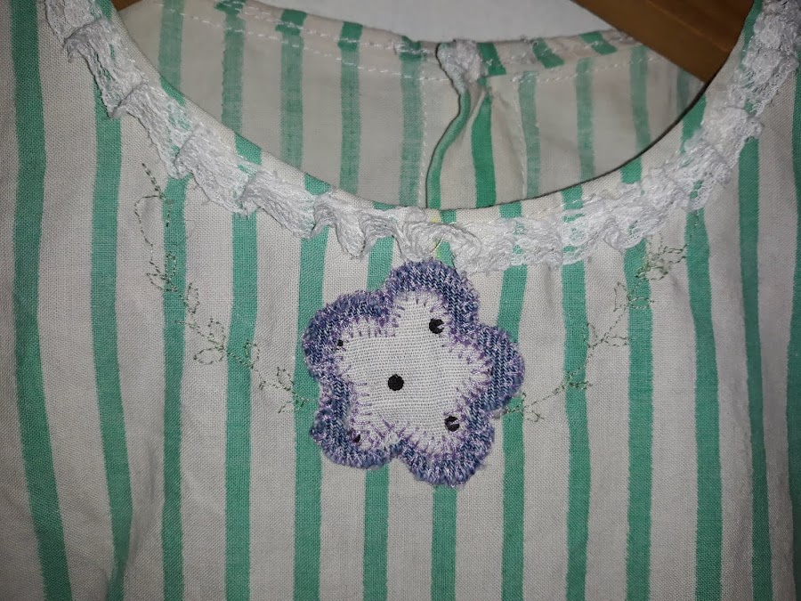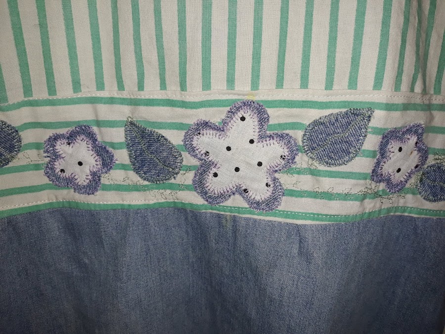 Hice 2 vestidos, uno para mi ahijada (4 años) y otro para su hermanita (9 años) usando para las faldas parte de una camisa de jean, las flores que agregué las hice con restos de una pantalón de jean que reciclé en un bolso, hace tiempo ya.