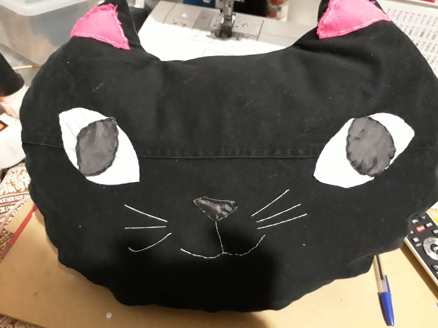 Con el pantalón viejo del uniforme de la oficina hice este almohadón para la hermana de mi ahijada. Le puso Gatúbela de nombre.