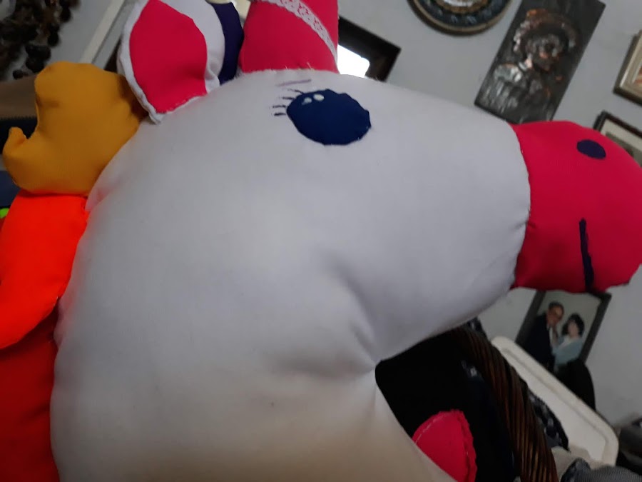Para mi ahijada un almohadón de unicornio, los ama. Tela que me sobró luego de hacer los banderines y adornos para su cumpleaños.