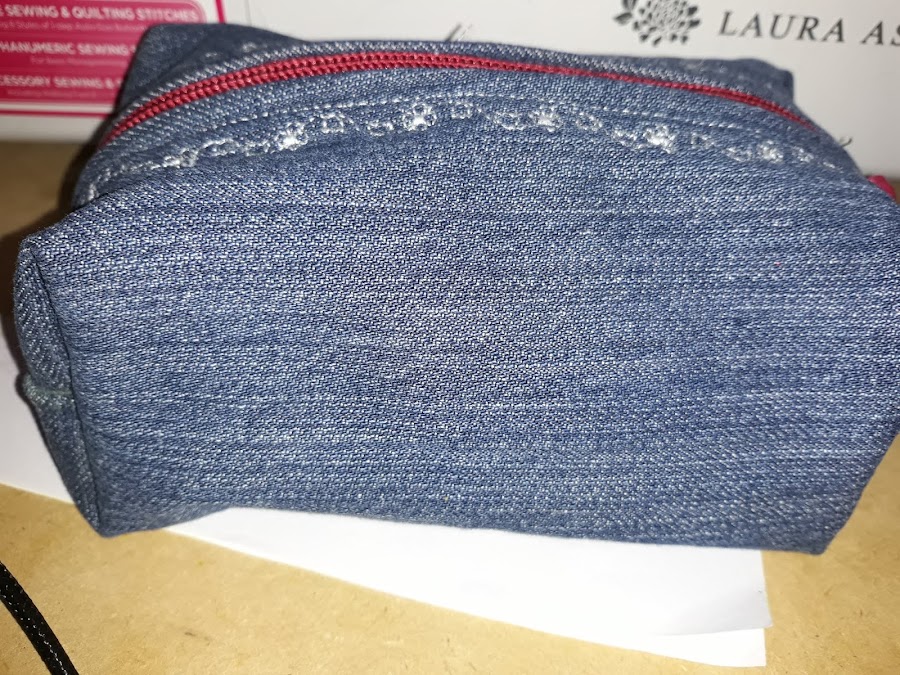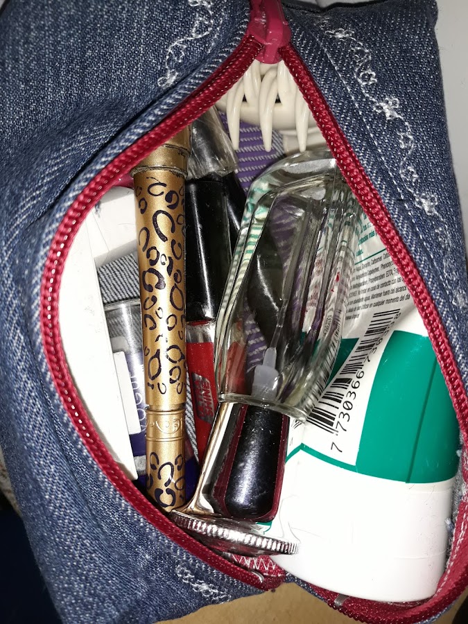 Con un trozo de la pierna de un jean que ya no uso hice un necessaire para llevar mis cositas (perfume, crema para manos, etc.), lo bordé con mi amada máquina de coser que me regaló mi padre en mi cumpleaños, tiene muchas funciones!!! Jejeje.