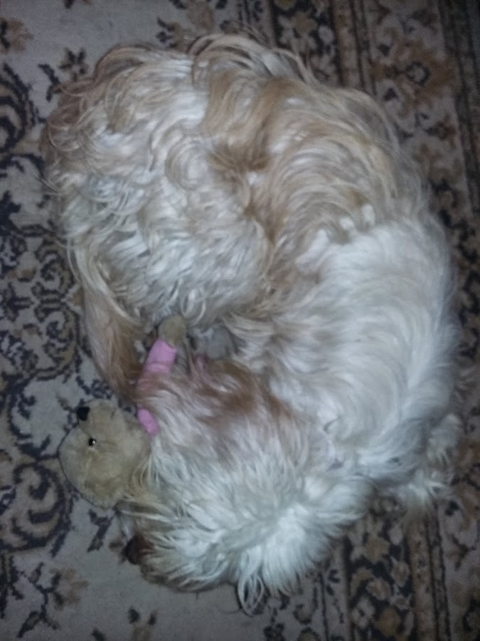 Y acá están mis dos mimosos, Emma y Ozzy, ella con su osita de peluche, con la que suele dormir a diario, a veces se pelean por la osa, Ozzy la hurta y se la lleva a su cucha y allá va ella, jajaja, la rescata y la trae a su propia cucha o a mi cama, ahí es cuando la osa se vuelve voladora, jajaja, se la tiro de nuevo a su cucha, ella corre bien feliz a seguir chupando su osa, jajaja, son fatales los dos, jajaja.