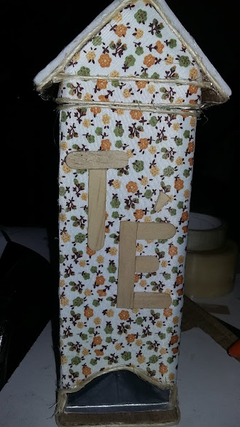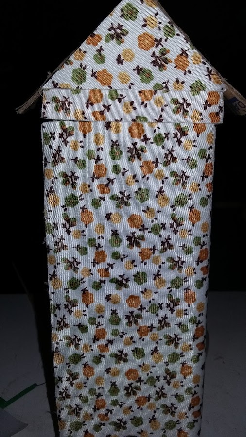 hice el "techo", con cartón que me sobró de una de las cajas que reciclé para la publicación anterior corté un rectángulo y lo doblé al medio y lo pegué con silicona caliente a la caja, luego hice lo mismo con una bandeja de telgopor, con el borde de la bandeja hice la parte superior del techo, porque la curvatura de esa parte daba una linda terminación al techo.