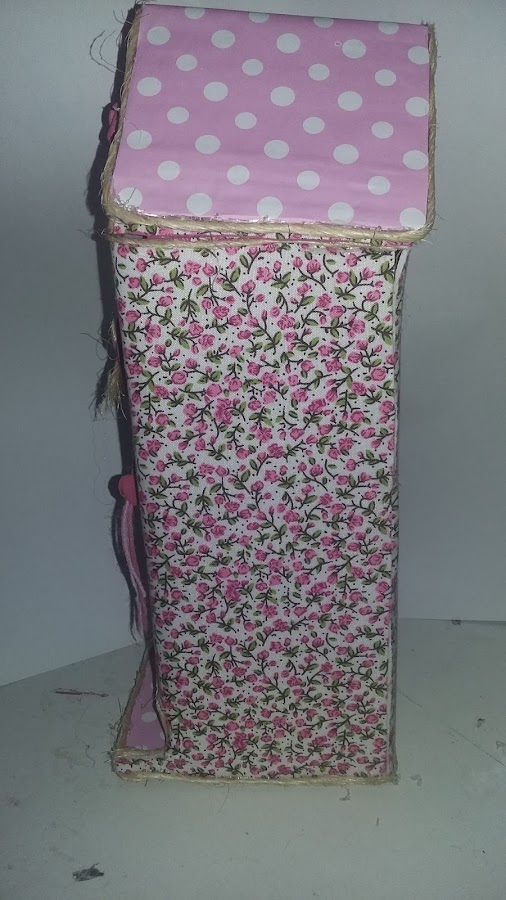 Con un trozo de lana hice una trenza, la pinté de rosa con látex y luego que estuvo seca pegué un extremo a la parte superior de la caja, o sea el techo, y en el extremo que se usa para cerrar la caja le pegué un corazón pequeño de goma eva, dejando unos 2 cm de lana sin trenzar.