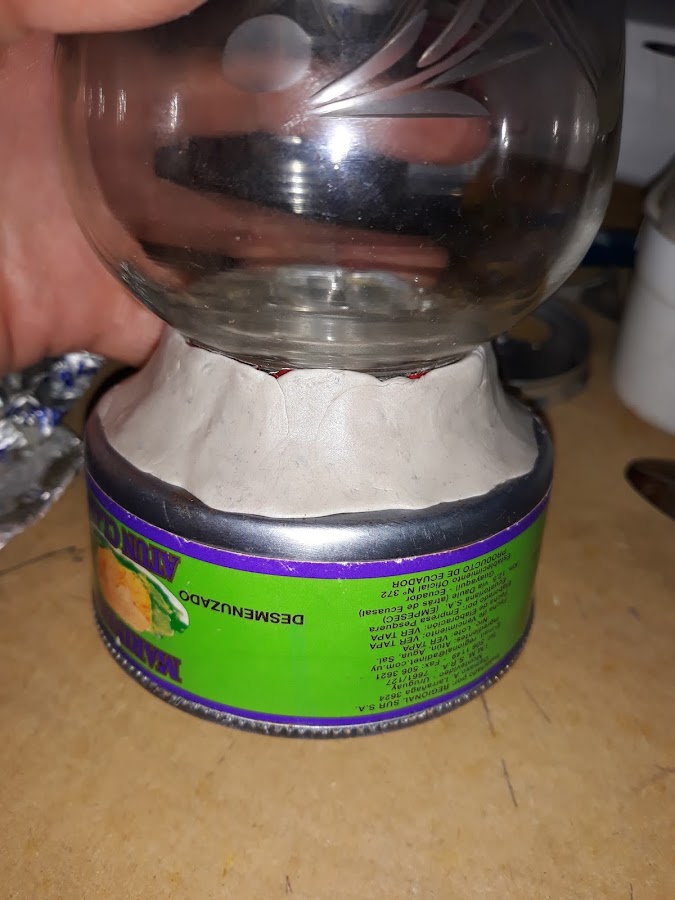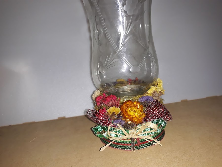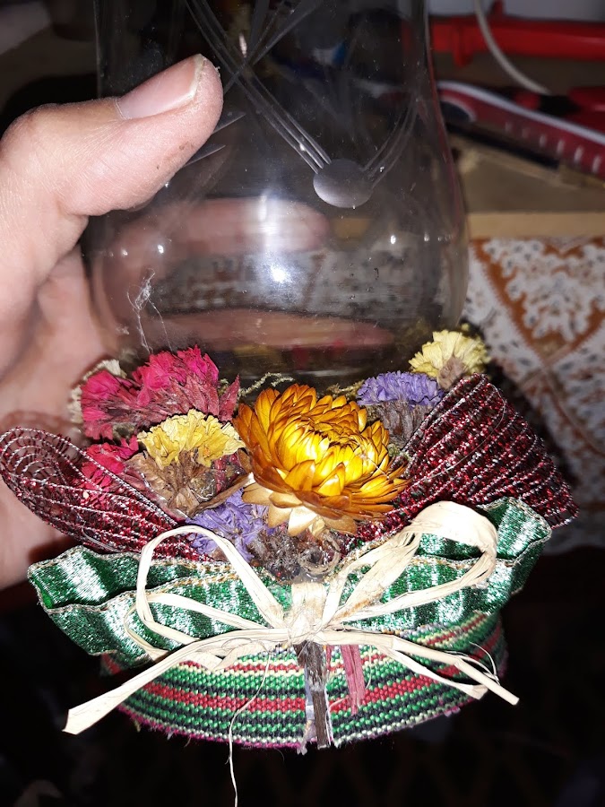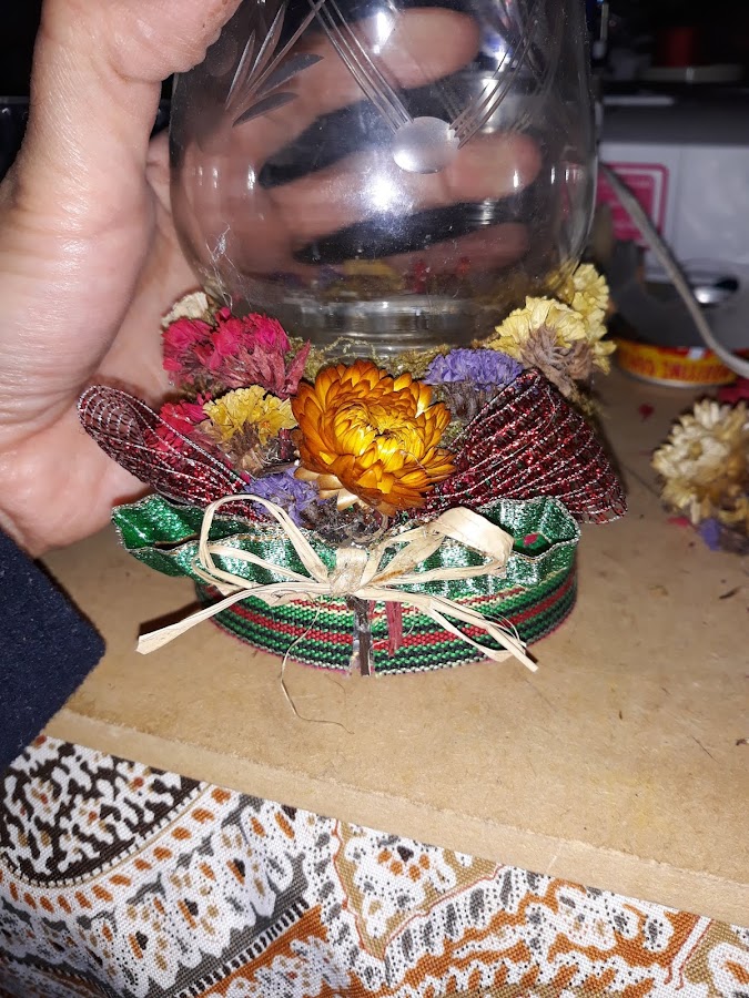 Utilicé una lata de atún y la parte superior de una lata de refresco, un trocito de goma eva entelada que sobró de otra artesanía, un poco de masilla epoxi, flores secas y un moño de rafia.