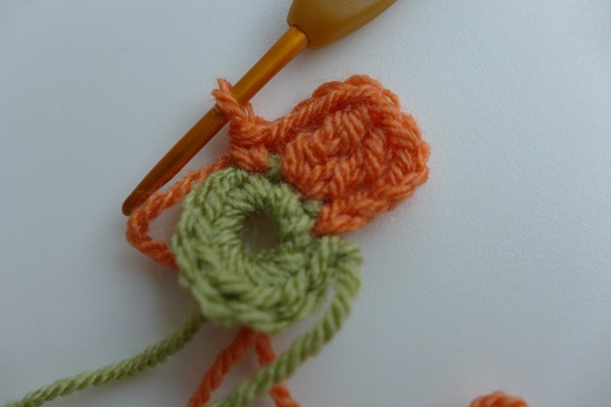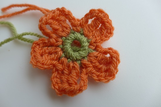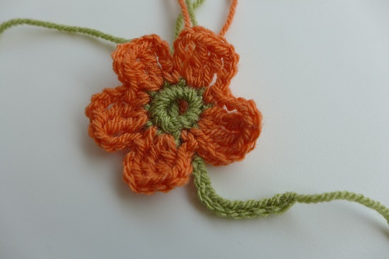 Repitiendo este proceso haremos los cinco pétalos de la flor. Después de las últimas 4 cadenetas, unirlas a la primera de ellas (recordad que al inicio de los pétalos hicimos 5 cadenetas) mediante 1 punto enano.