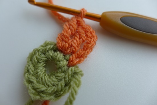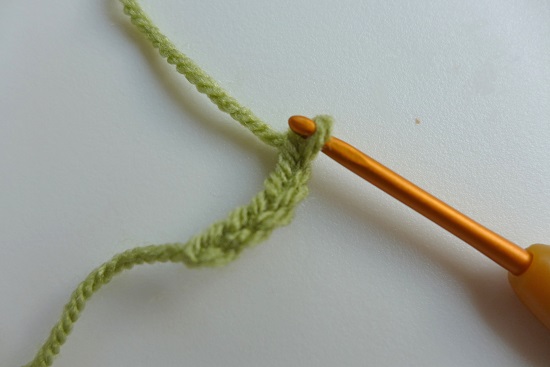 tejer un punto de cadeneta y a continuación 1 punto bajo en cada punto de cadeneta de la base