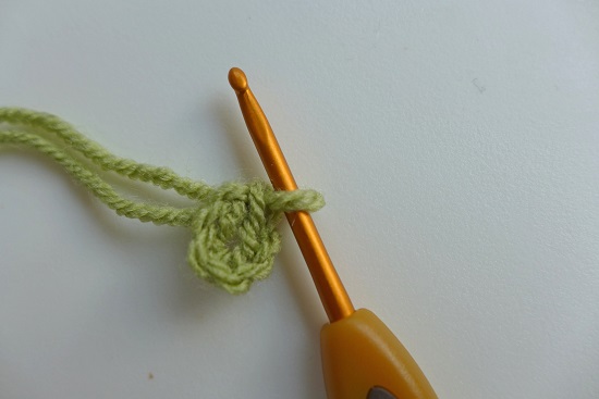 Tejer 1 punto de cadeneta y a continuación 9 puntos bajos en el círculo de cadenetas inicial, de forma que nos quedan 10 puntos en total