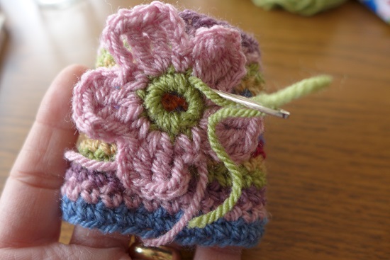 Cortar el hilo, y con otro color vamos a hacer los pétalos.