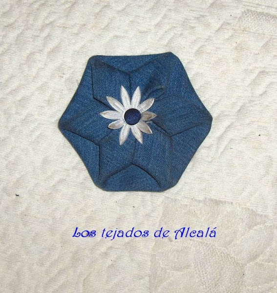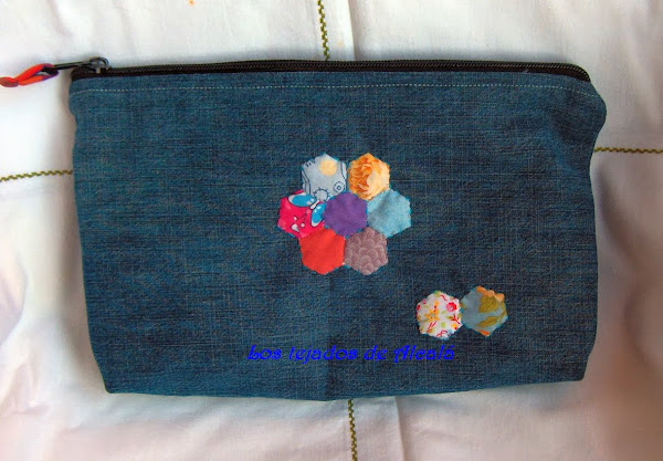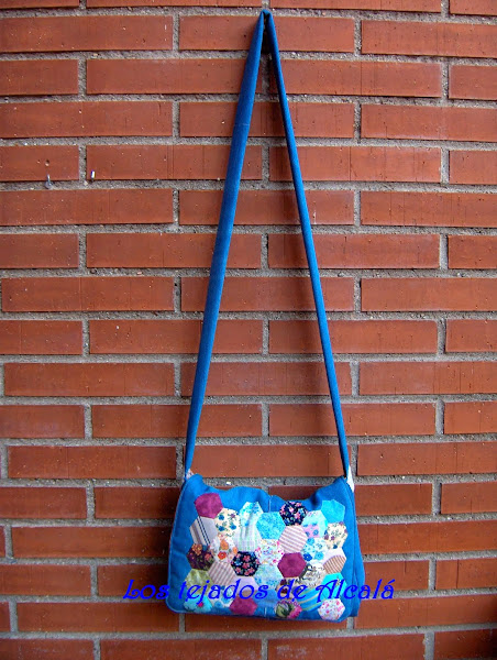 Un bolso en bandolera con hexágonos aplicados aprovechando pequeños trozos de tela.