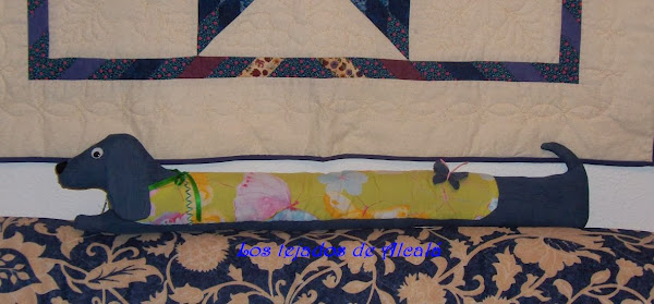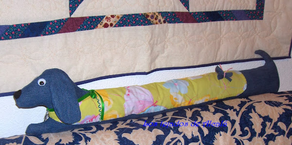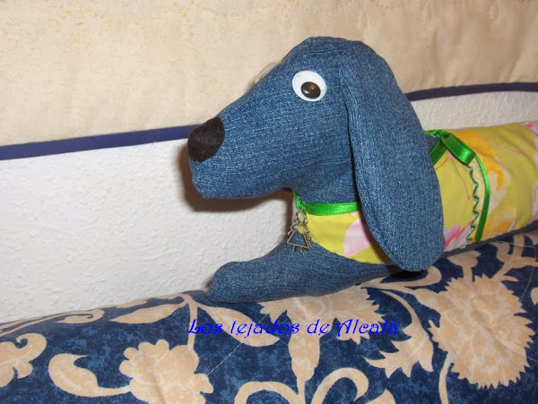 Un perrito salchicha cortafrío para la puerta. La mariposa también está hecha de tela vaquera. La manta que lleva era un vestido muy primaveral.