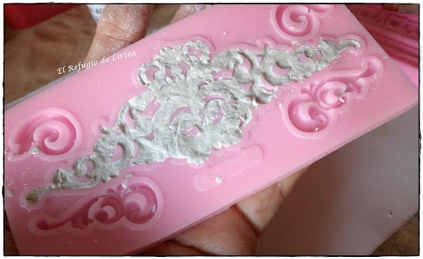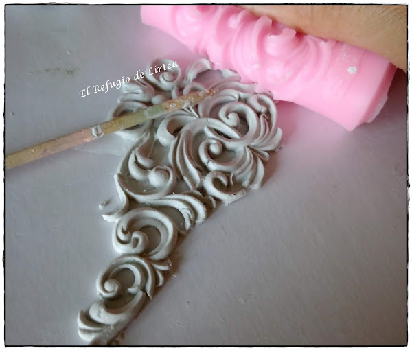 Voy a rodear la imagen con unas cadenetas hechas con pasta de modelar de secado al aire,( pasta Das) y ayudándome de unos moldes de silicona flexibles.