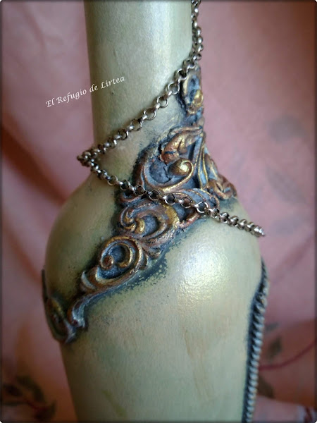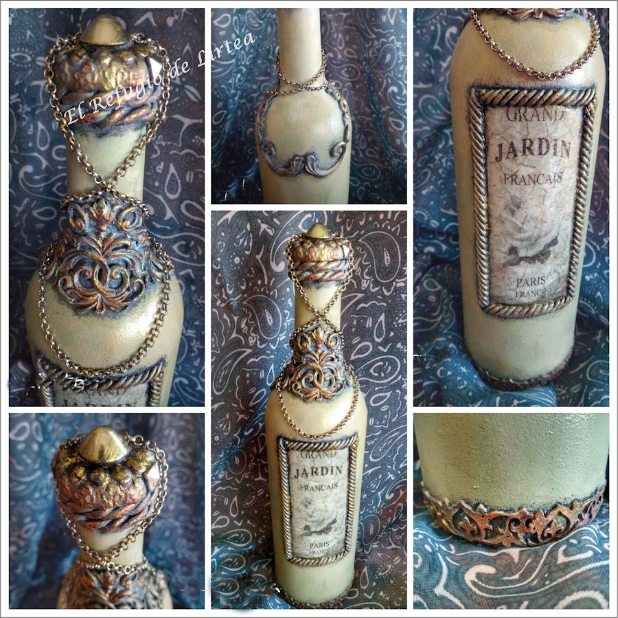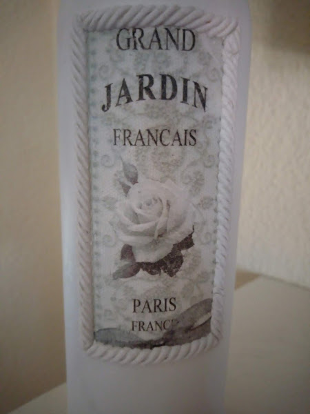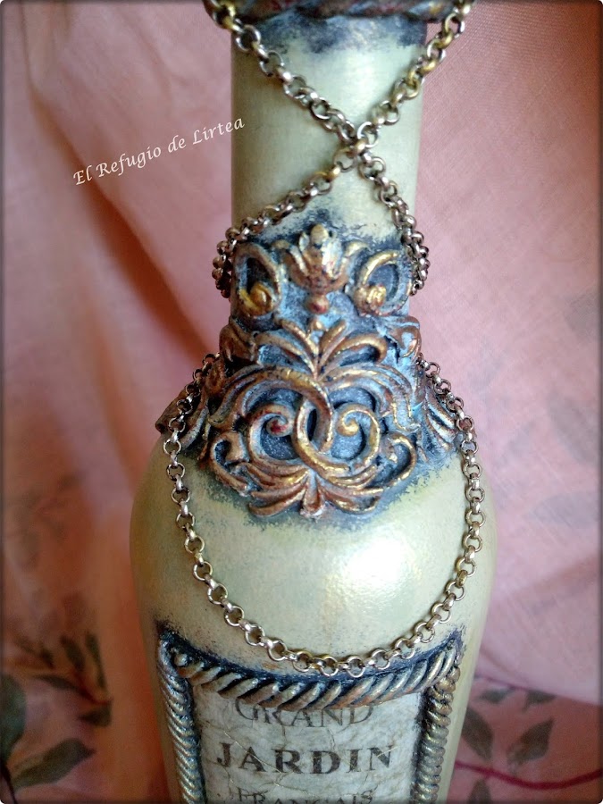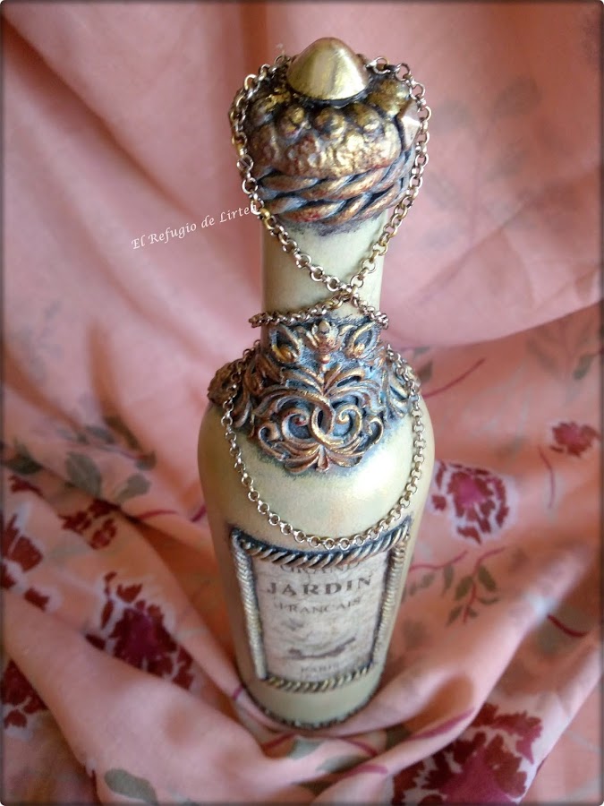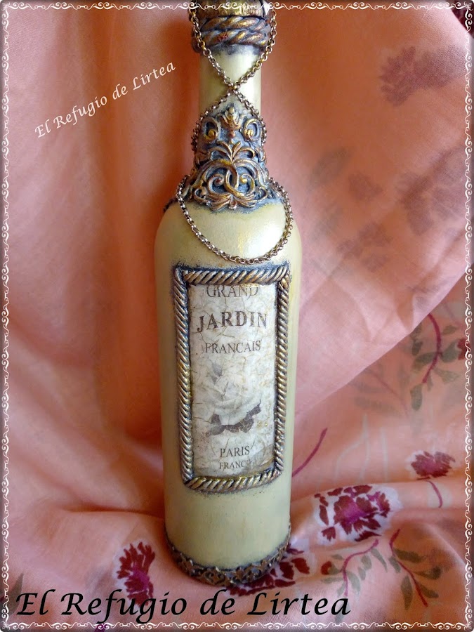 Con la técnica del decoupage, pego una imagen de papel de arroz en el centro de la botella, a modo de etiqueta. La técnica ya la sabéis de sobra y si sois nuevas seguidoras os emplazo a ver el tutorial que hice sobre decoupage Aquí.