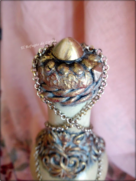 El tapón de la botella lo corto a ras, lo cubro de igual modo con pasta y coloco algunos elementos metálicos.