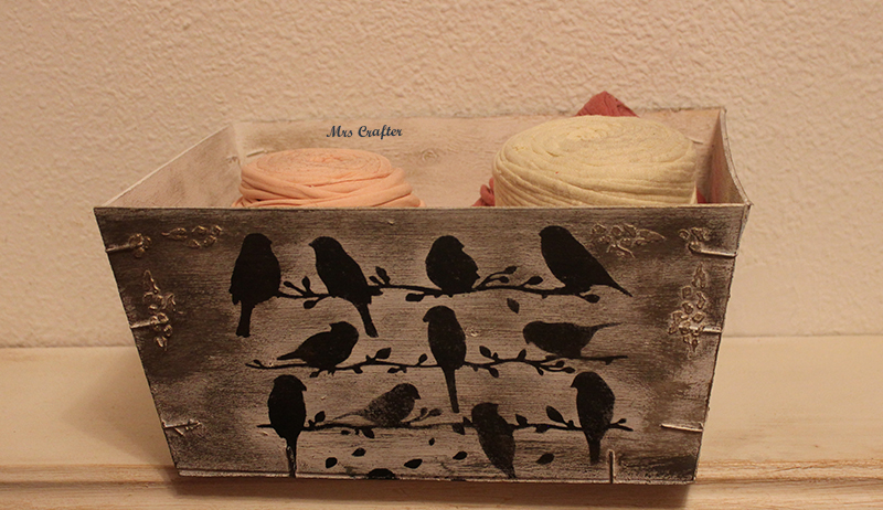 Empecé con un blanco sobre la madera, directamente, sin lijar, saqué mis papeles y plantillas, un recorte por aquí, pasta de relieve por allá, unos cuantos pájaros en la trasera, y para acabar, pincel secoDejé a la vista las grapas porque me parecía que reforzaban el estilo que quería darle.