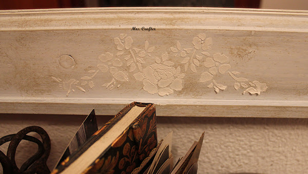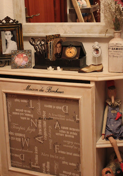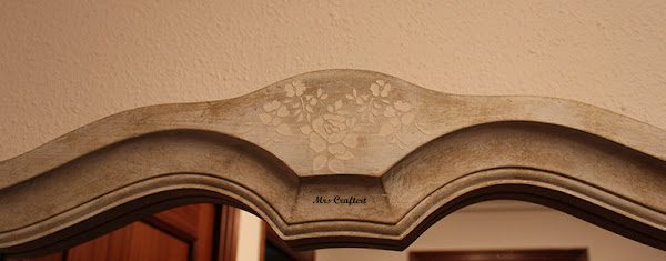 Después de darle muchas vueltas, "lo pinto...no lo pinto.... me gusta la madera pero me queda mejor en claro....", me decidí a pintarlo como el mueble de la entrada, que también ha pasado por su tuneo correspondiente. Y, bueno, chalk paint blanca, pincel seco en gris piedra y flores con pasta de relieve.