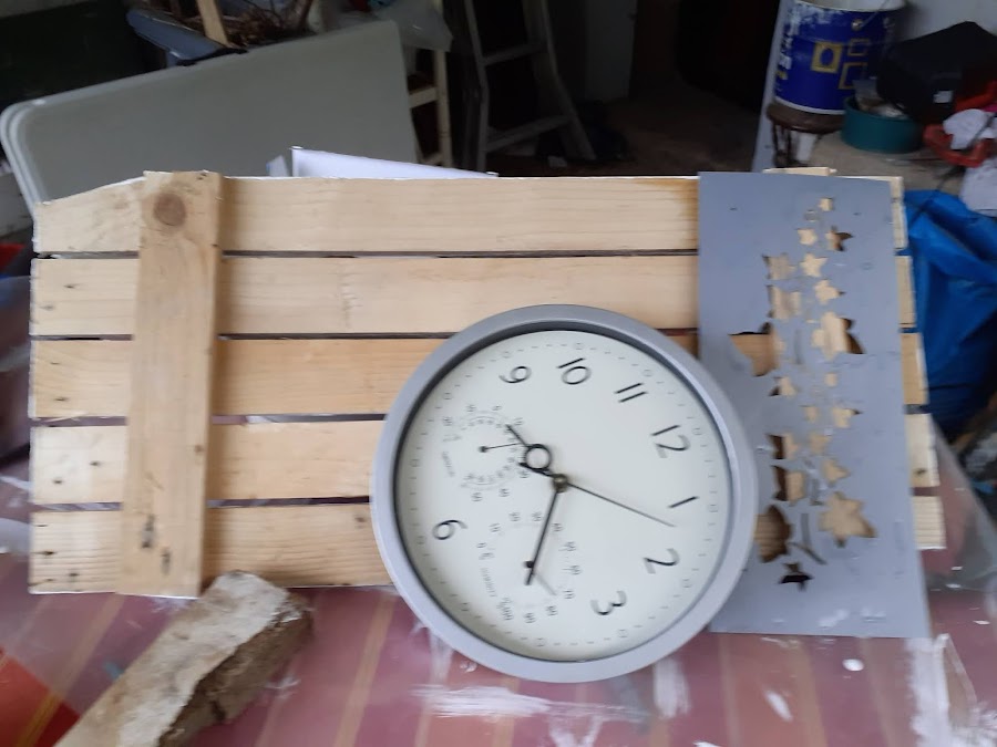 Aqui lo que se puede hacer con unas tablas viejas... una poca pintura ..unas plantillas y un reloj de cocina olvidado