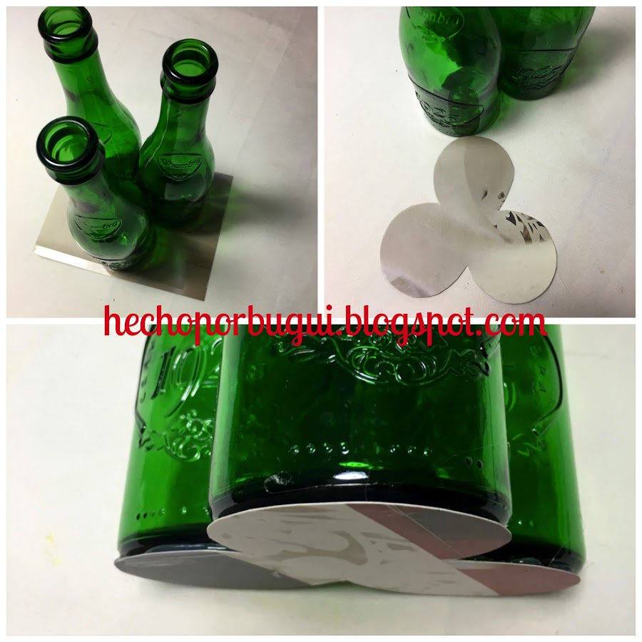 Busqué un trozo de cartón, dibuje el contorno de las tres botellas y en la posición que las quería poner, recorte y pegue con silicona.