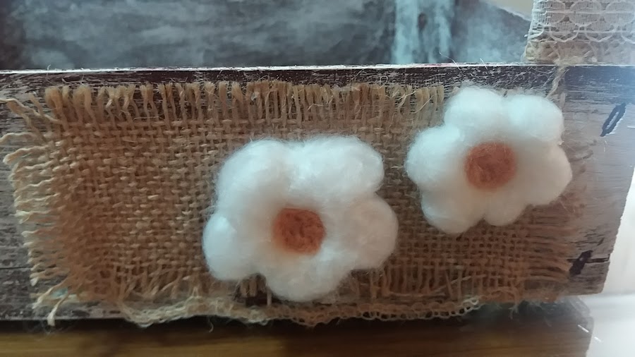 Como estaba haciendo flores con lana afieltrada, para ensayar, quité la de plástico y preferí ponerle de estas.