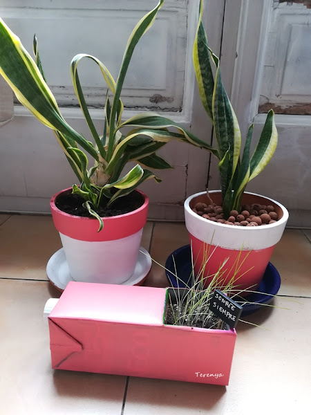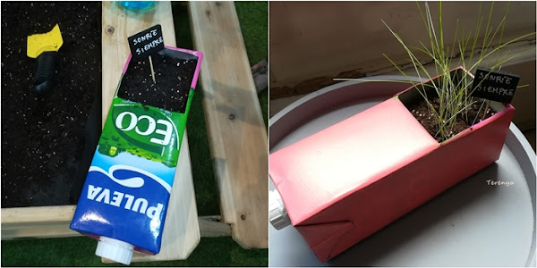 A la vez que pintaba mi silla, le di a la brocha a unas macetas y al pequeño huerto que hice en la feria Biocultura... Un tetrabrick en el comedor luce más mono pintado, ¿verdad?